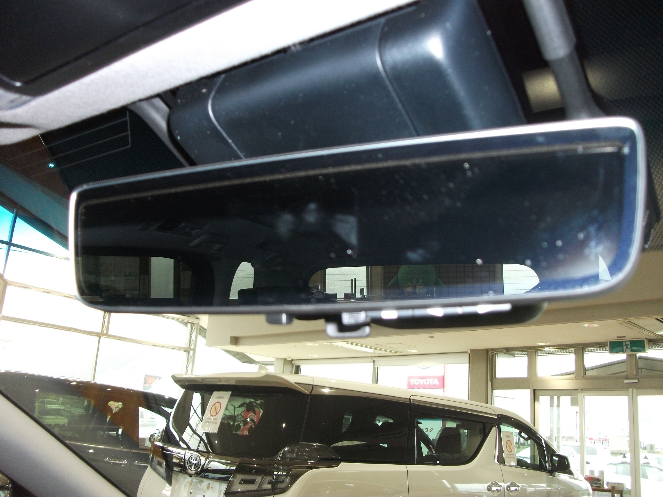 メーカーオプションで搭載してあるデジタルインナーミラーをご紹介いたします。デジタルインナーミラーはリアウインドウに付いているカメラで後方を映すことができ、写真のようにルームミラーにデジタル画像で見ることができます。アルファードのようなミニバンですと後部座席に何人も乗る機会も多いでしょうから便利な機能といえるでしょう。