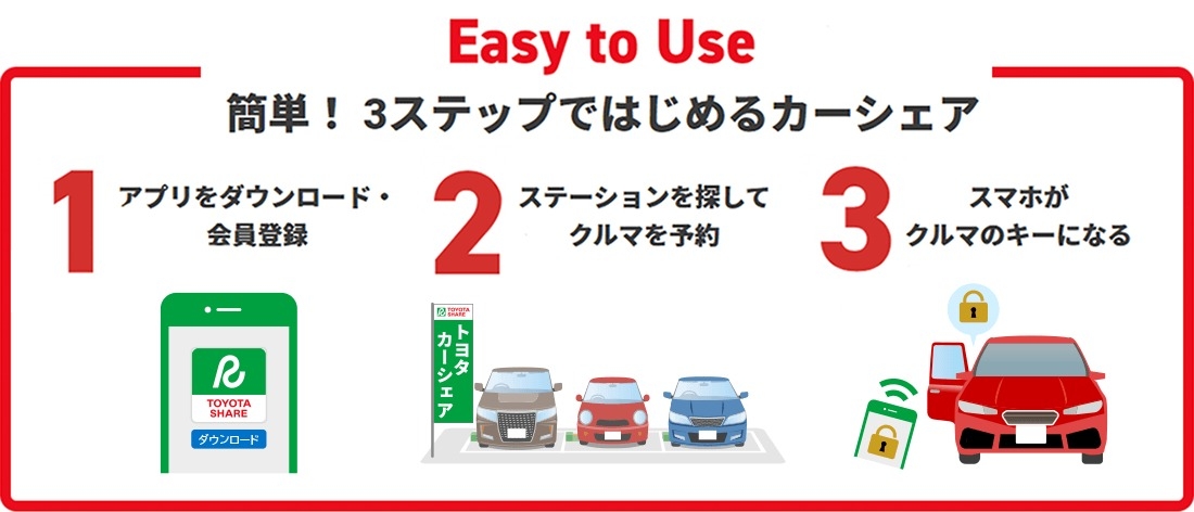 「トヨタシェアカー」とは、専用アプリを通じて車両を予約して、