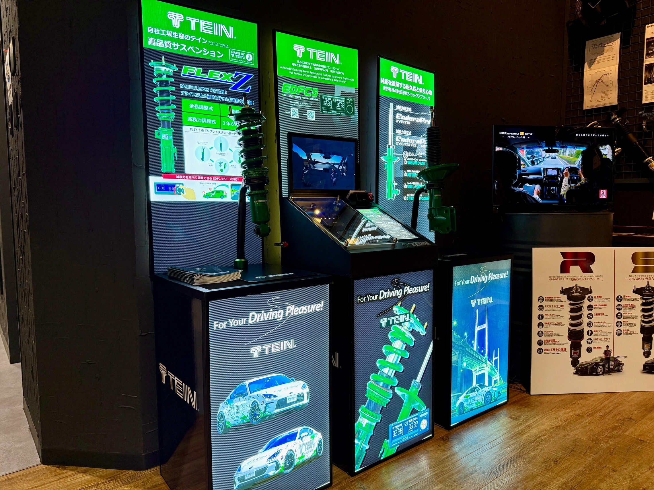 ディスプレイにはストリートユースの車高調として人気も高い「 FLEX Z(フレックスゼット)」、そして純正以上の耐久性と乗り心地を提供する純正形状ショックアブソーバ「EnduraPro(エンデュラプロ)」を展示しています。