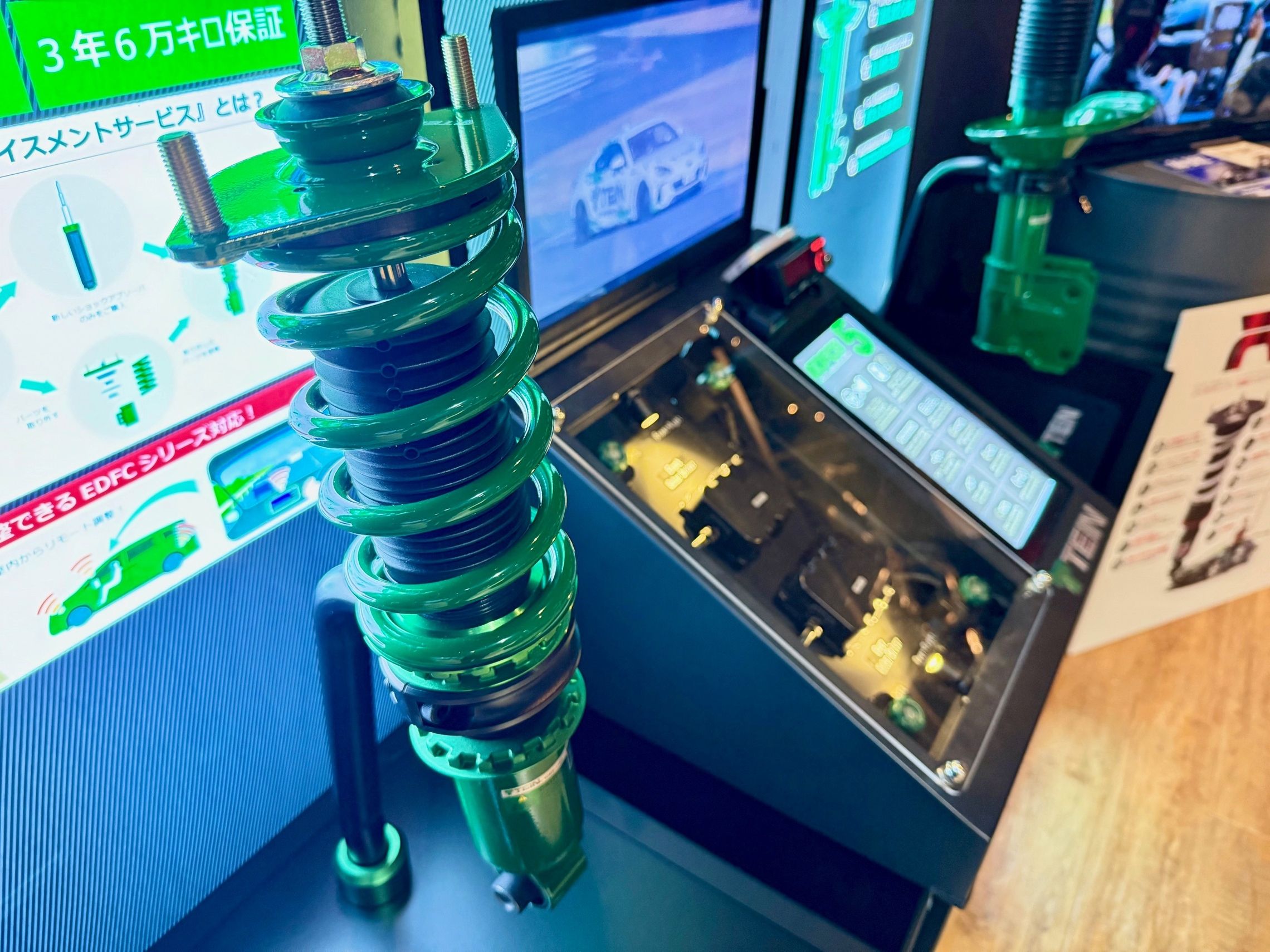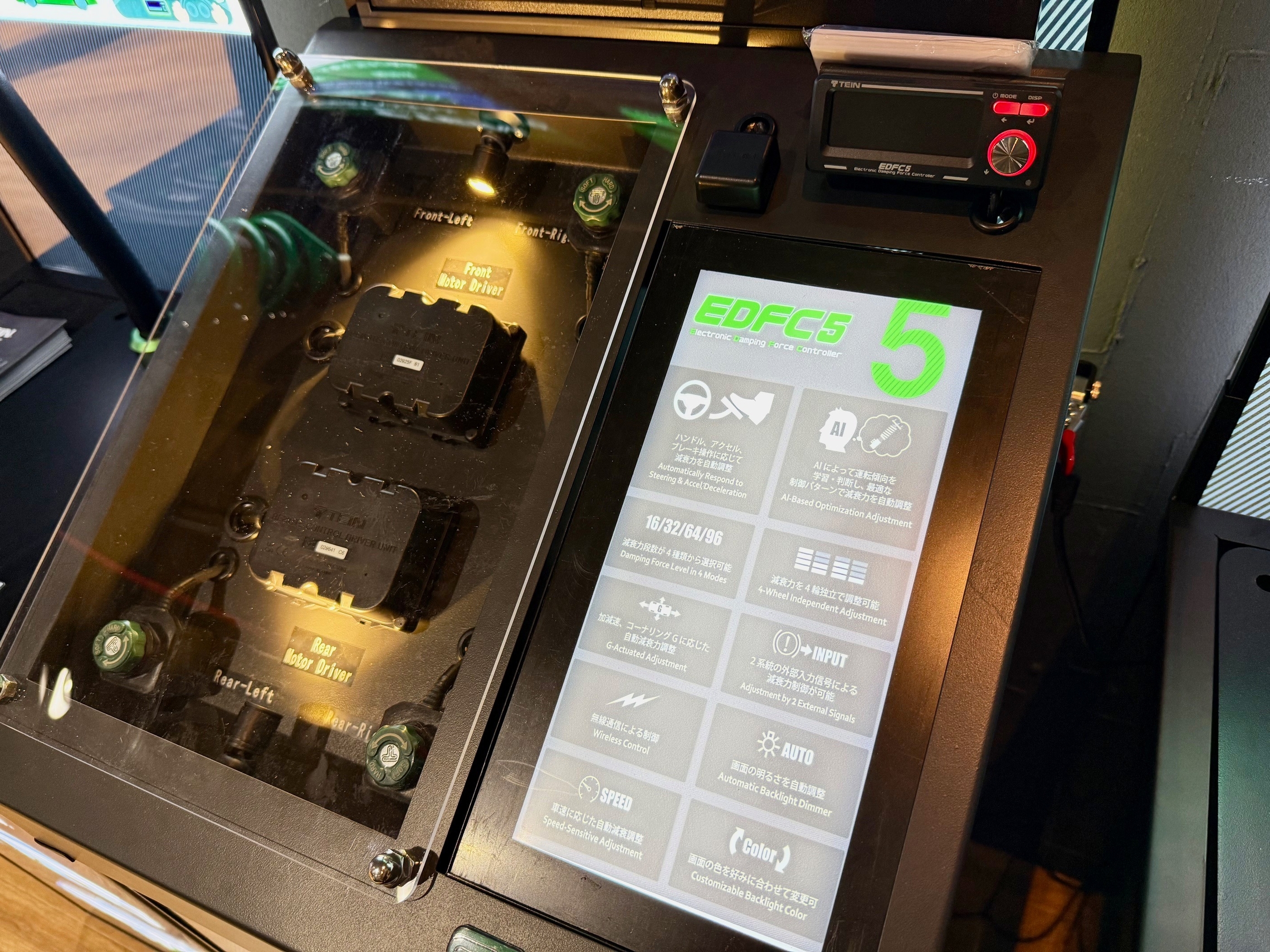 そして、減衰力調整が可能なTEINサスペンションに取りけることで、室内で簡単に減衰力調整が行える電動減衰力コントローラ「EDFC」も展示中。4輪の各ショックアブソーバに取り付けられたモーターがスムーズに作動し減衰力を切り替える様子をデモ機で確認していただけます!