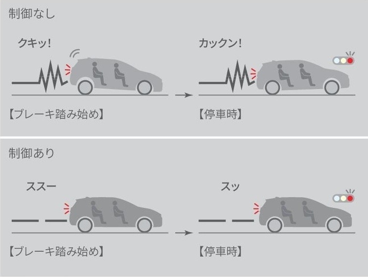 スムーズストップは、停止直後の車両の前後の揺れ動きを抑え、乗員の姿勢変化を低減するよう補助してくれます。