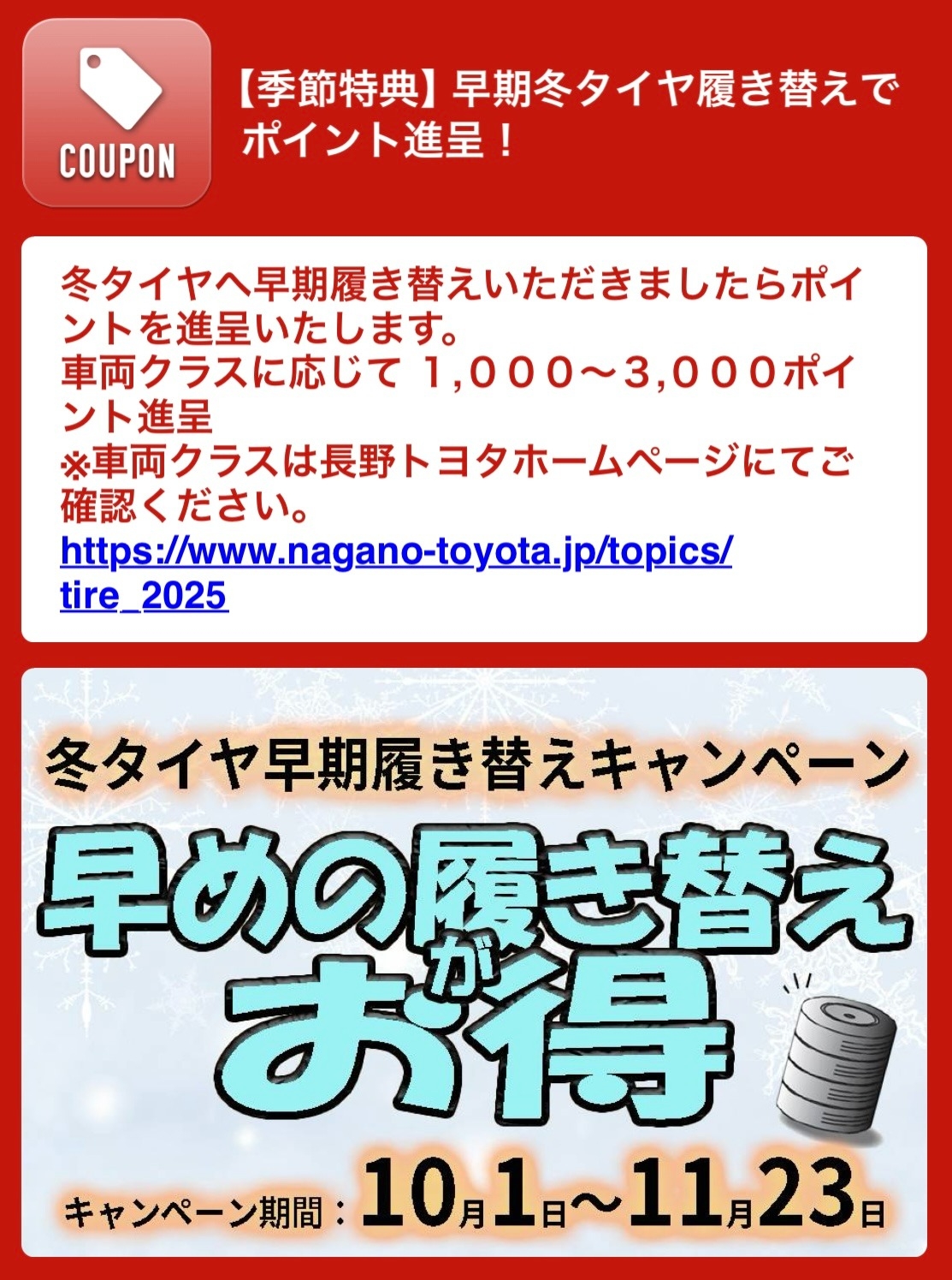 タイヤ履き替えサイズによって1,000~3,000ポイントプレゼント