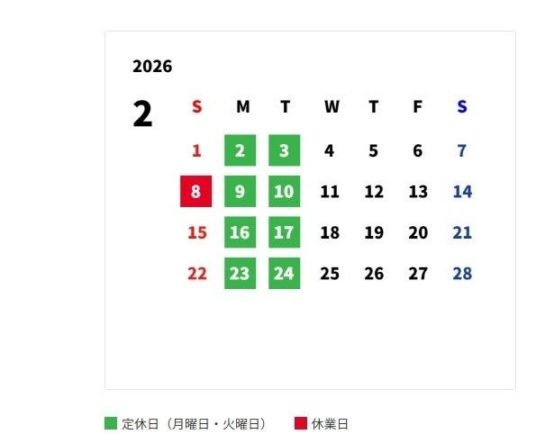 2月8日(日)は、休業日とさせていただきます。ご注意ください。