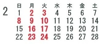 2月の定休日のご案内です。
