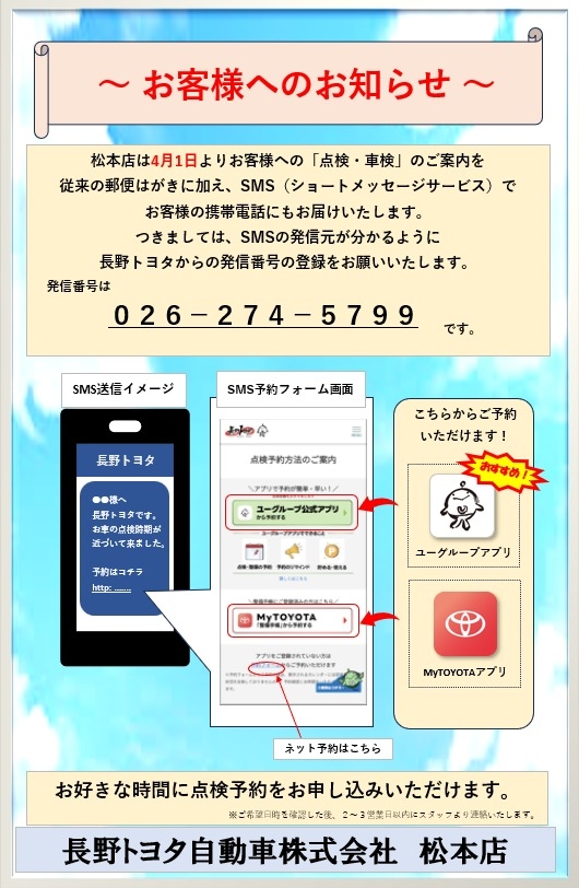 電話番号が登録されていないもしくは変更になったお客様はお手数ですが松本店、松本北サービスサテライトまでご連絡ください!