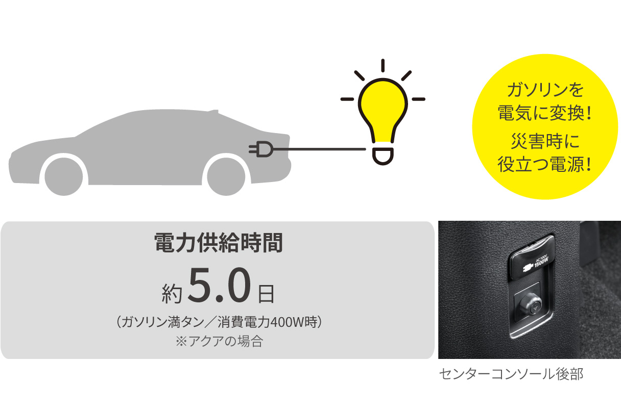 コンセント(AC100V・1500W)を、センターコンソール後部に設置。非常時給電システムを使用することで、災害などによる非常時に電力が必要な時、車両の走行機能を停止した状態で、AC100Vで消費電力の合計が1500W以下の電気製品を使用できます。