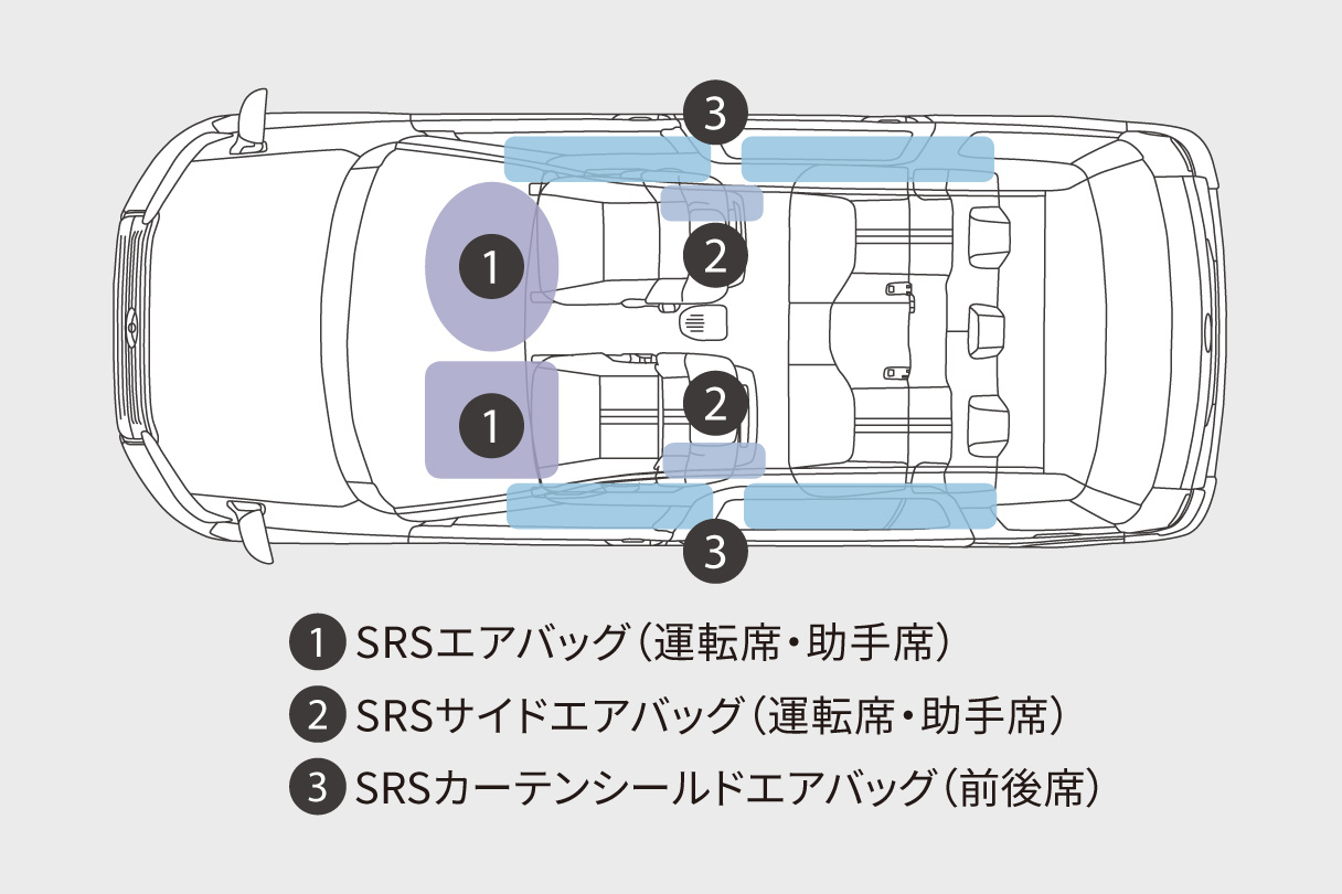 前席乗員の頭や胸に作用する衝撃力を分散・緩和させるSRSエアバッグから、後席乗員の頭部側面まで保護するSRSカーテンシールドエアバッグまで、合計6つのエアバッグを設定しています。