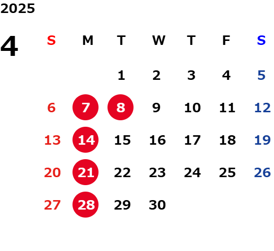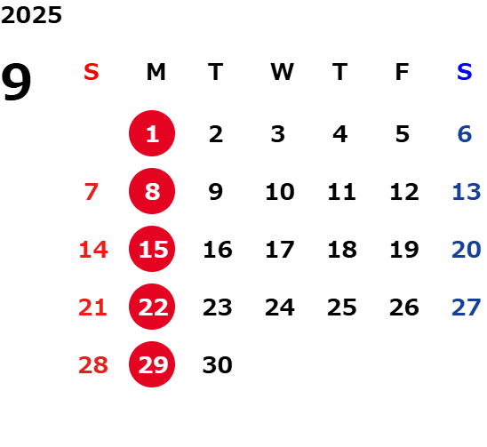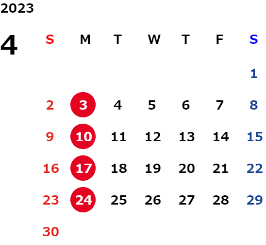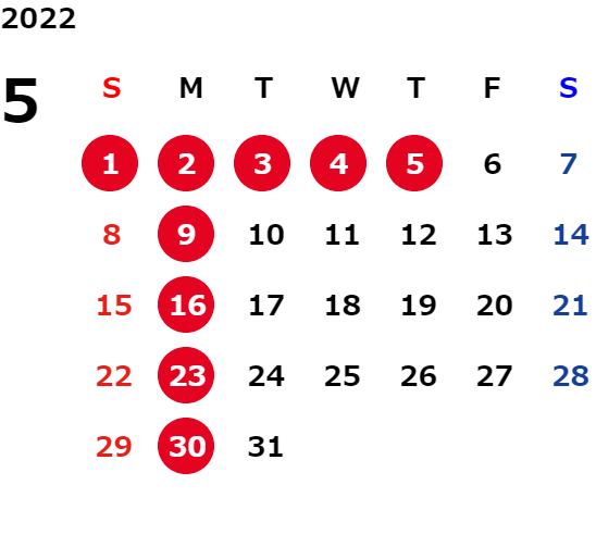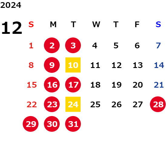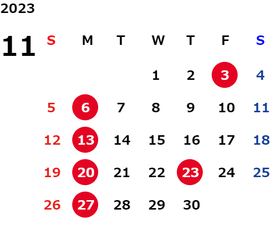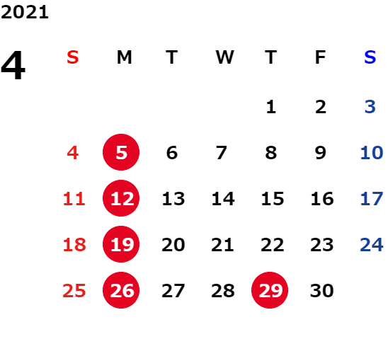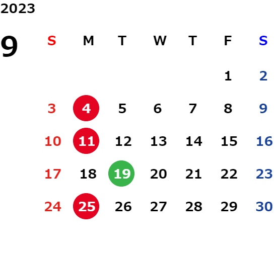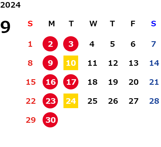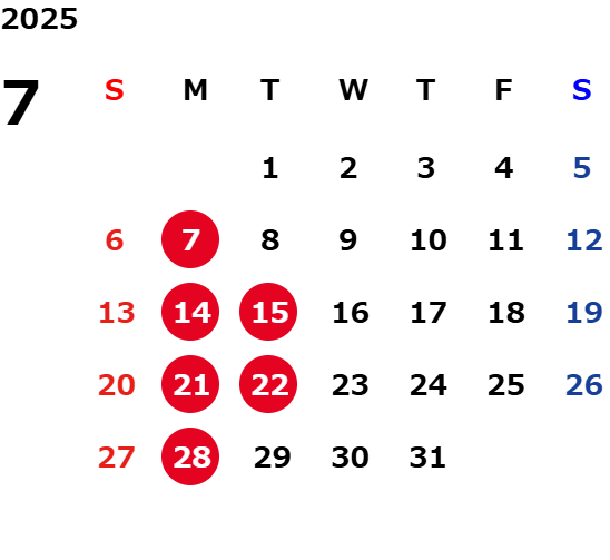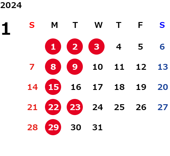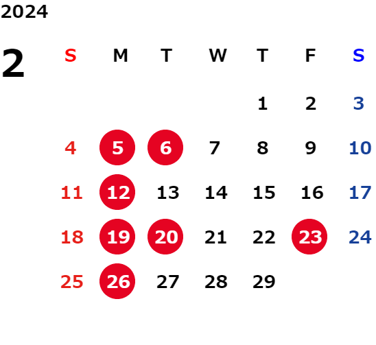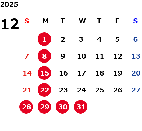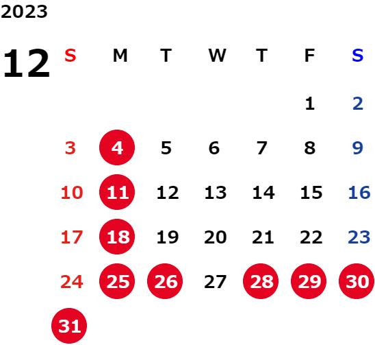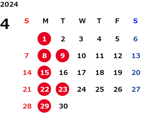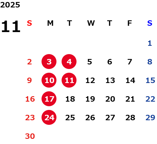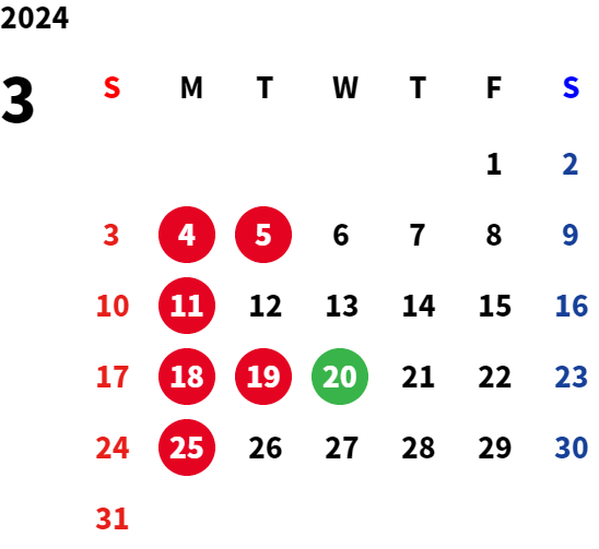 火曜日・祝日の定休日につきましては 下記カレンダーをご確認ください