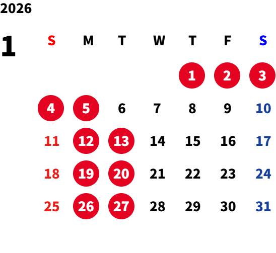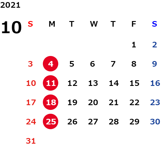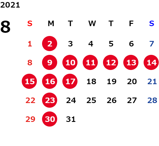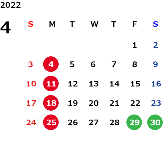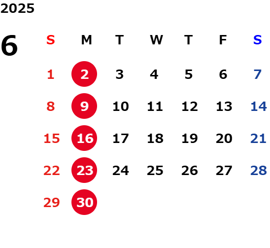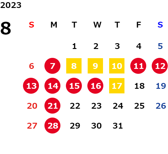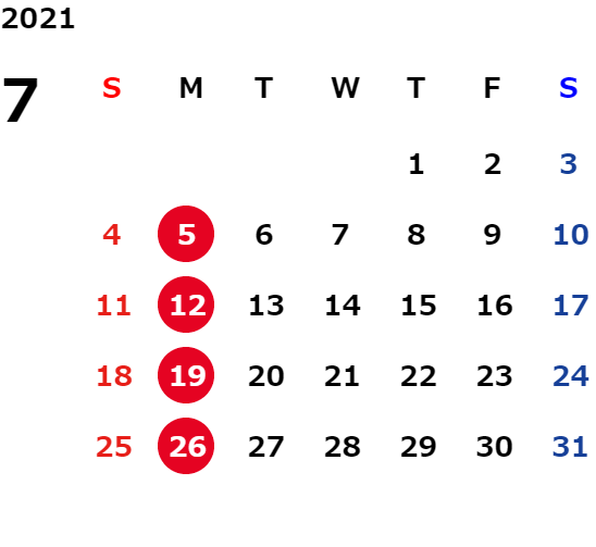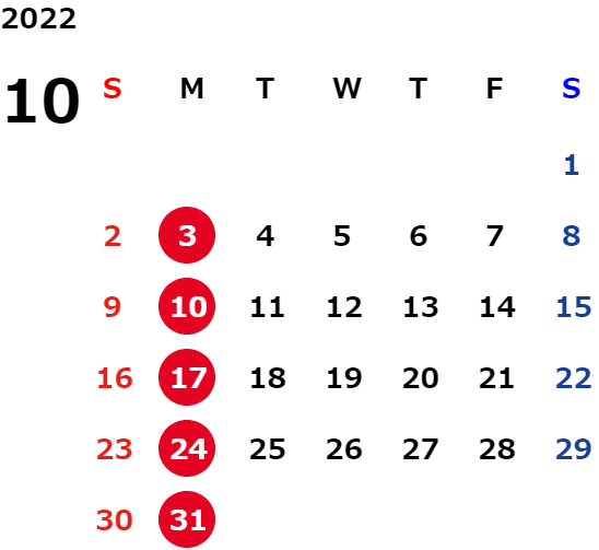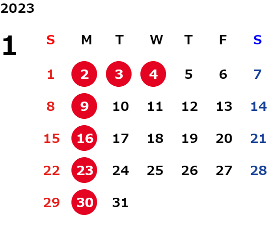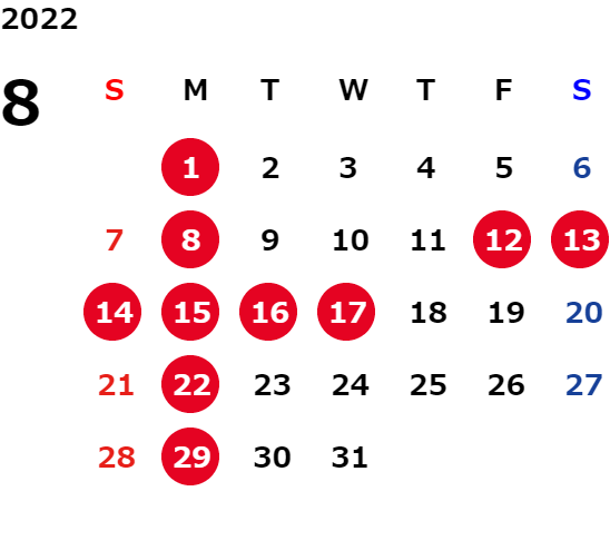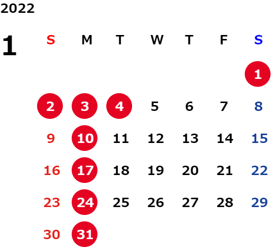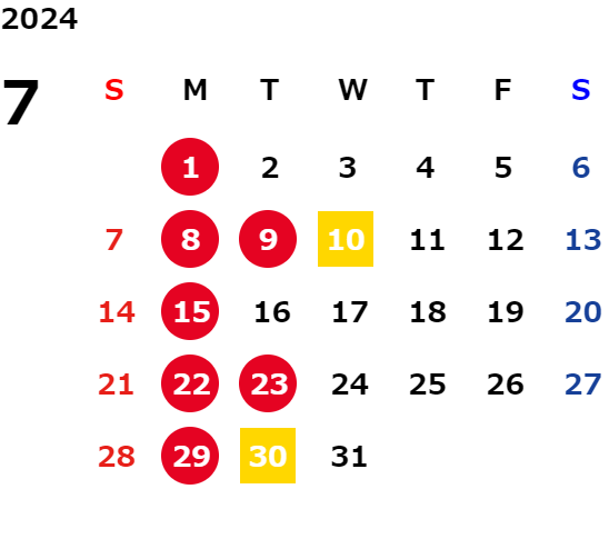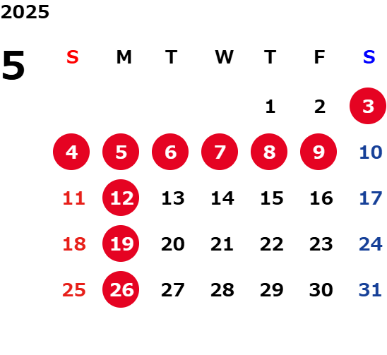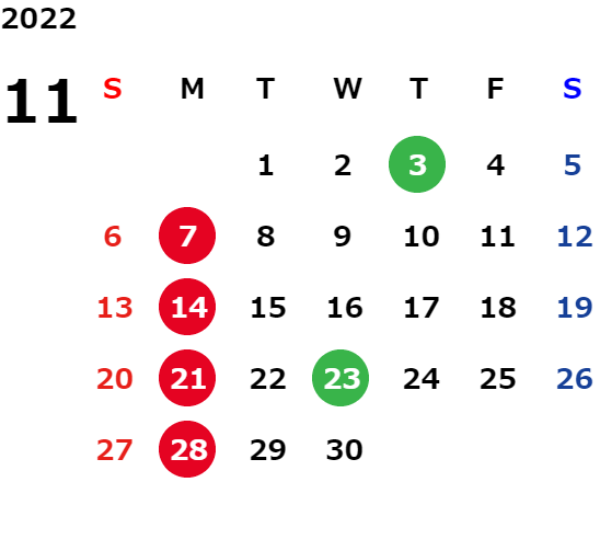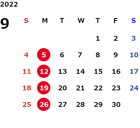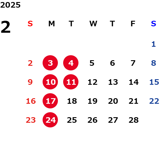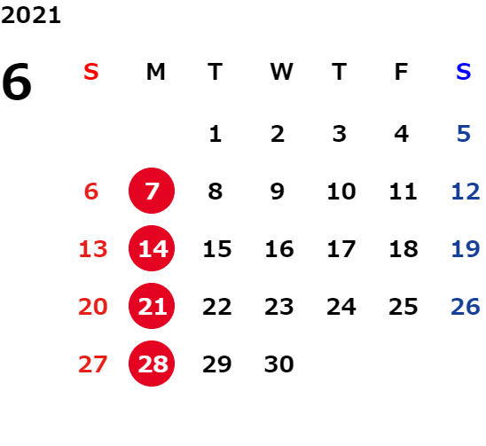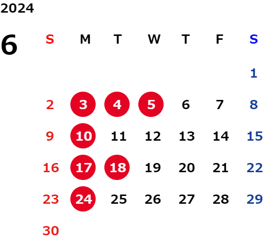 火曜日・祝日の定休日につきましては 下記カレンダーをご確認ください