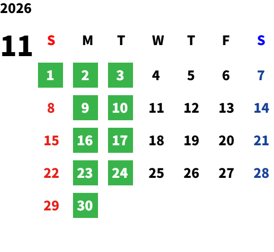 不定期で日曜日、詳しくは営業日カレンダーを