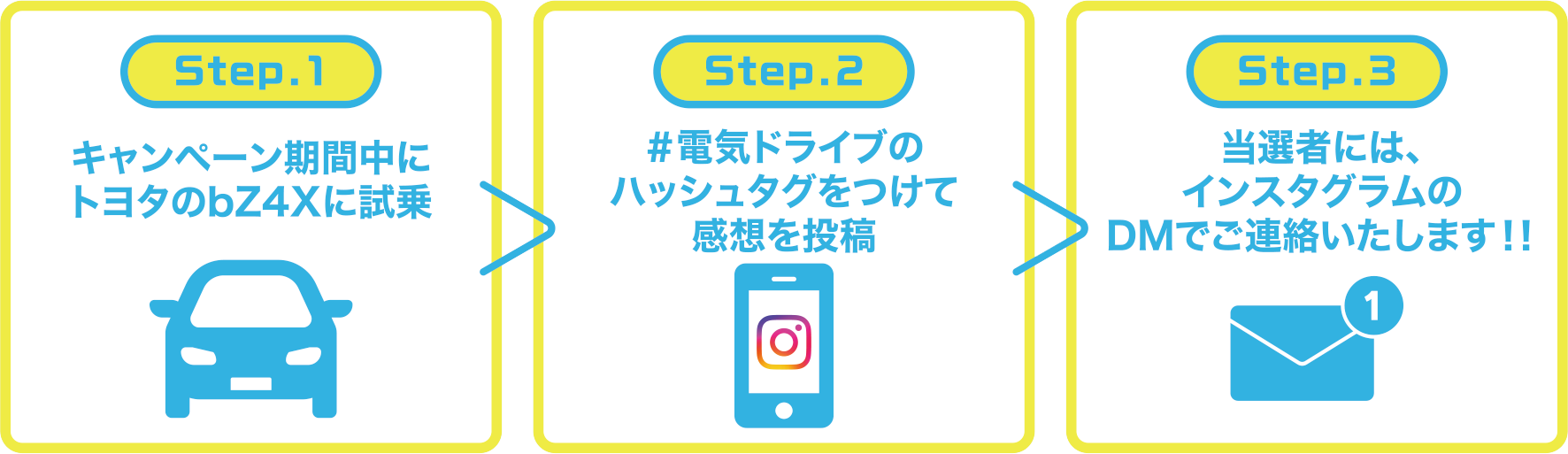 応募方法 bZ4X試乗後の感想(ミル、フレル、ノル)を、ハッシュタグ「#電気ドライブ」を付けてインスタグラムに投稿いただくと応募完了となります。